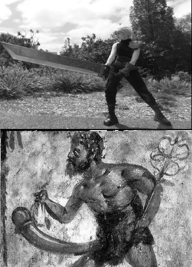 Cloud Strife and Priapus, both virtually depicted with shifting images depicted across eras—from Playstation 1 to Playstation 5, from Ancient Athens to Imperial Rome—one holding a Buster Sword that's, of course, vaguely phallic, and the other holding a large phallus that's, of course, often used as a deadly weapon, both tortured via an ambiguous demigod-adjacent genetic lineage (Jenova and Aphrodite?)—S+P investigates, both directly and via specific character digressions, these two confounding mirror images over the course of its 20 modal cantos.